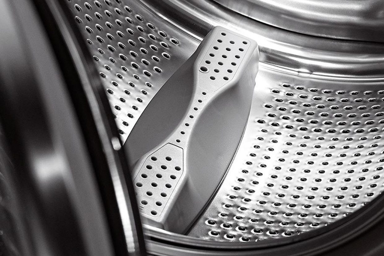 With Active Drum ™ the hour-glass shaped, removable lifters and the slanted drum move the laundry to the drum centre to reduce fabric wear. Dirt is removed via bigger holes at the edge.